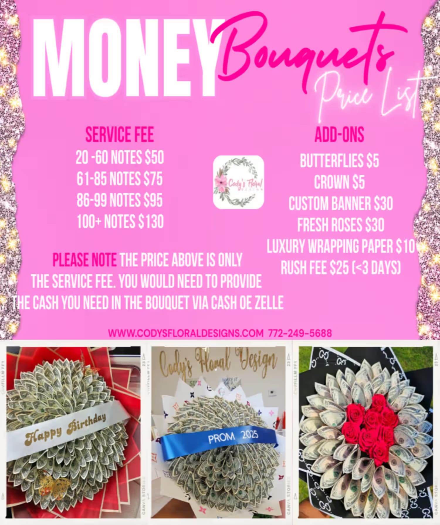 Our Money Bouquet comes in different styles and different colors (red, white, black, pink etc) and name brand wraps (chanel, louis vuitton, gucci, christian dior). Please be advised to place your order at least 3-5 days in advance from pick up or delivery date. Any orders placed less than 3 days from pick up or delivery date will have a rush order fee and may only choose from the color wrapping paper available at that time. No exceptions.